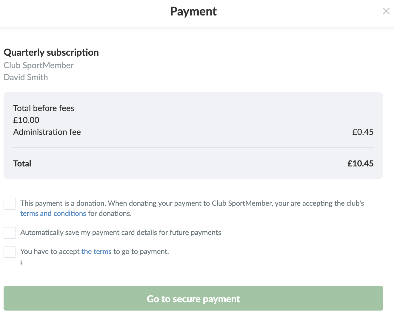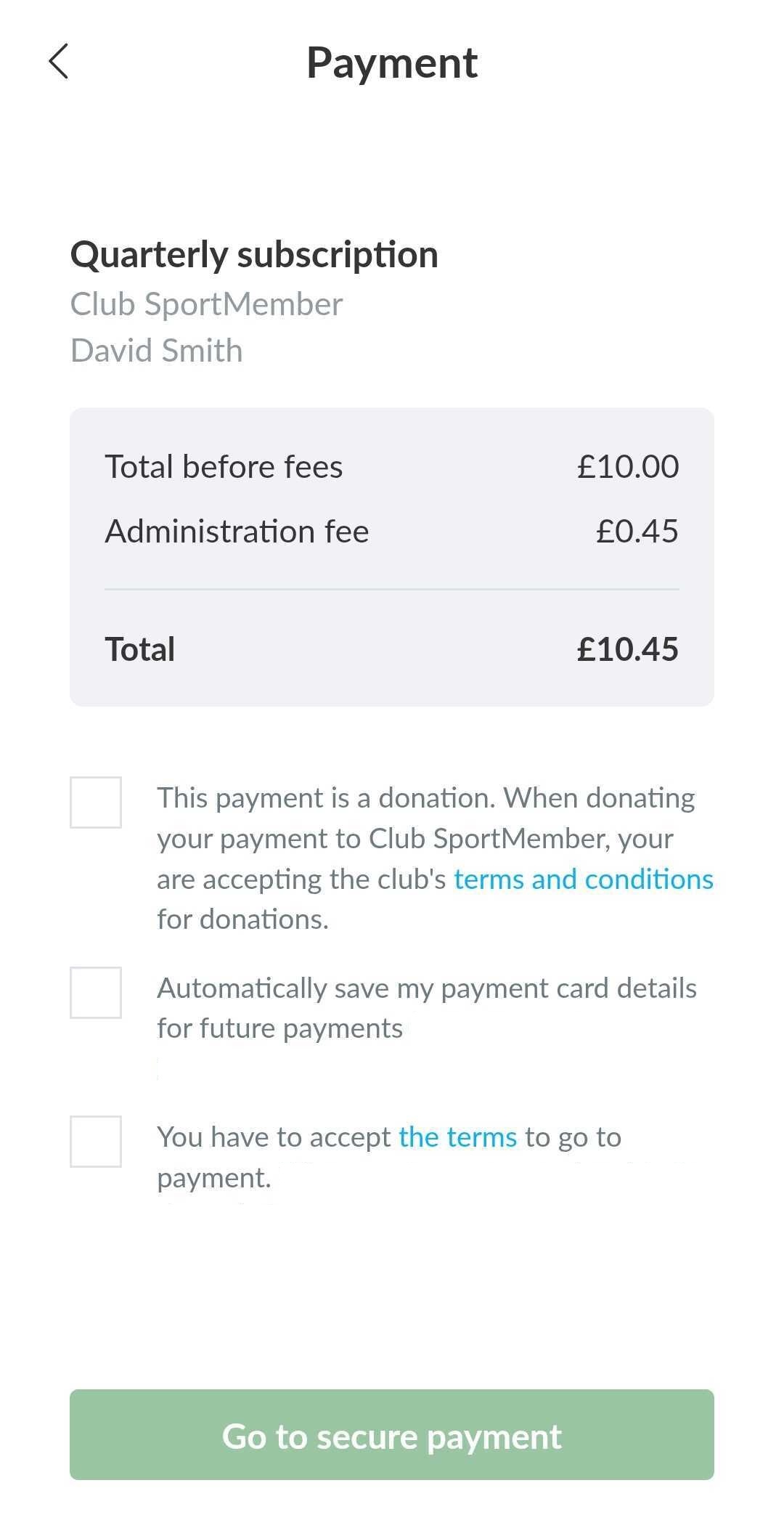 On the payment page you will see information about the price of the membership fee, any administration fee and terms and conditions that you MUST accept.
