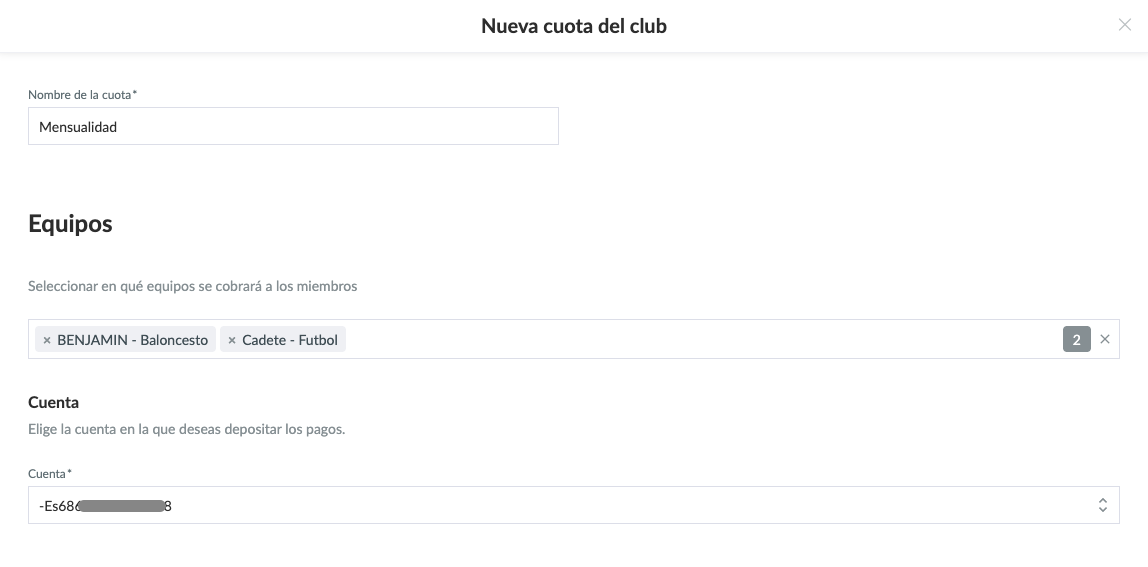 - Selecciona el/los equipo/s para el que quieres crear la cuota, o elige "todos" si aplica a todo el club.