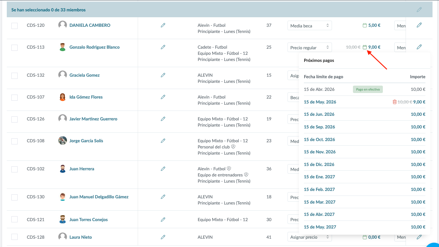 NOTA: Al cliquear en el icono verde del calendario podrás modificar los importes de los próximos pagos, aplicar descuentos, recargos o exceptuar del pago a miembros específicos. Por ejemplo, si algún deportista se lesiona y no quieres cobrarle el siguiente mes, pero pasado ese periodo se le volverá a cobrar la cuota asignada.