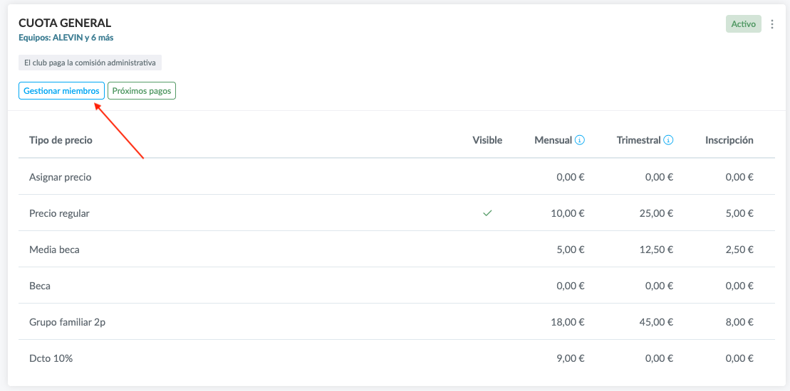 Una vez que ya creaste tu cuota, deberás asignarle a cada miembro el tipo de precio que debe pagar. Para eso haz clic en el botón azul Gestionar miembros.